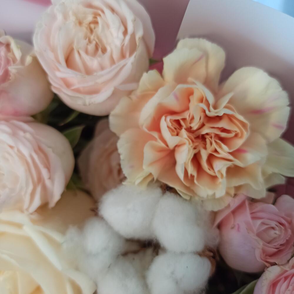 Гвоздики, Пионовидные розы, Розы