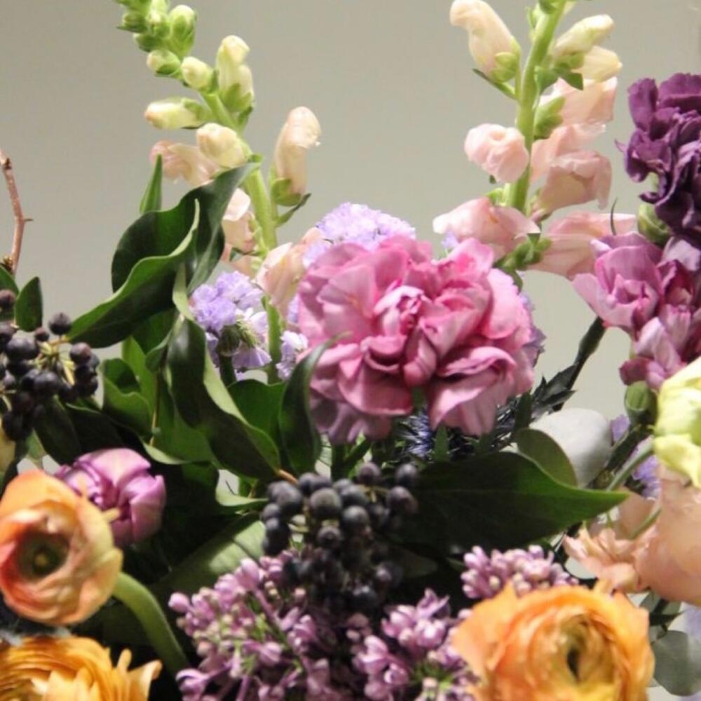 Ранункулюс – 5 шт.Тюльпан – 3 шт.Сирень – 2 шт.Гвоздика – 5 шт.Плющ – 2 шт.айва ветка – 1 шт.колючки ветка – 1 шт.Эвкалипт – 5 шт.Лизиантус – 2 шт.Лента – 1 шт.