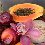 Съедобный букет из орхидей, роз, фруктов и зелени в дизайнерской коробке "Осень в тропиках"