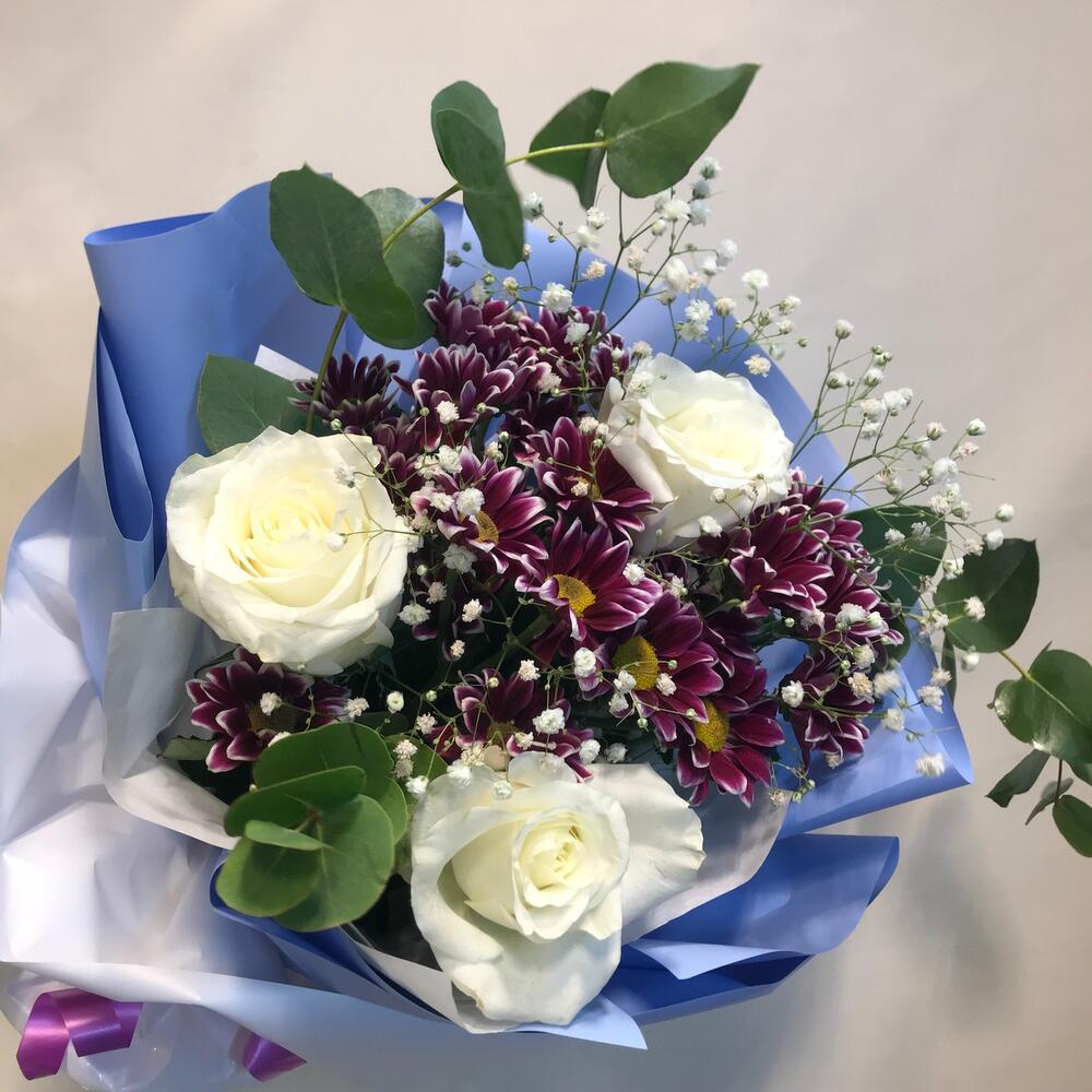 Роза Эквадор белая – 3 шт.Хризантема кустовая хайдар – 3 шт.Гипсофила – 1 шт.Эвкалипт – 3 шт.Упаковка дизайнерская – 2 шт.