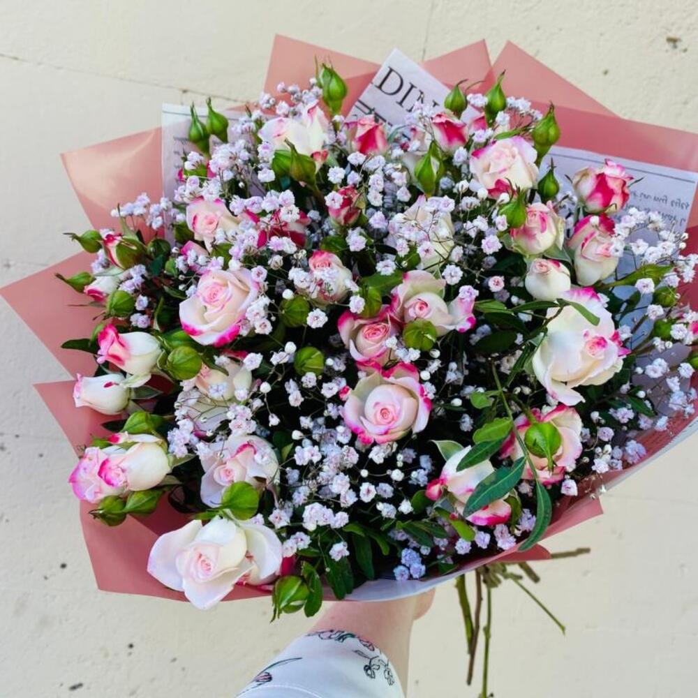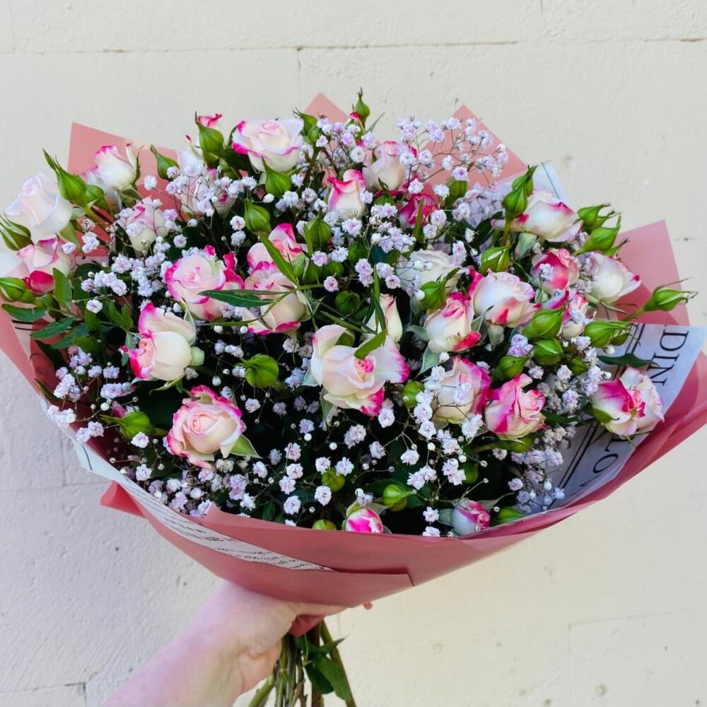 Букет из кустовых роз с гипсофилой