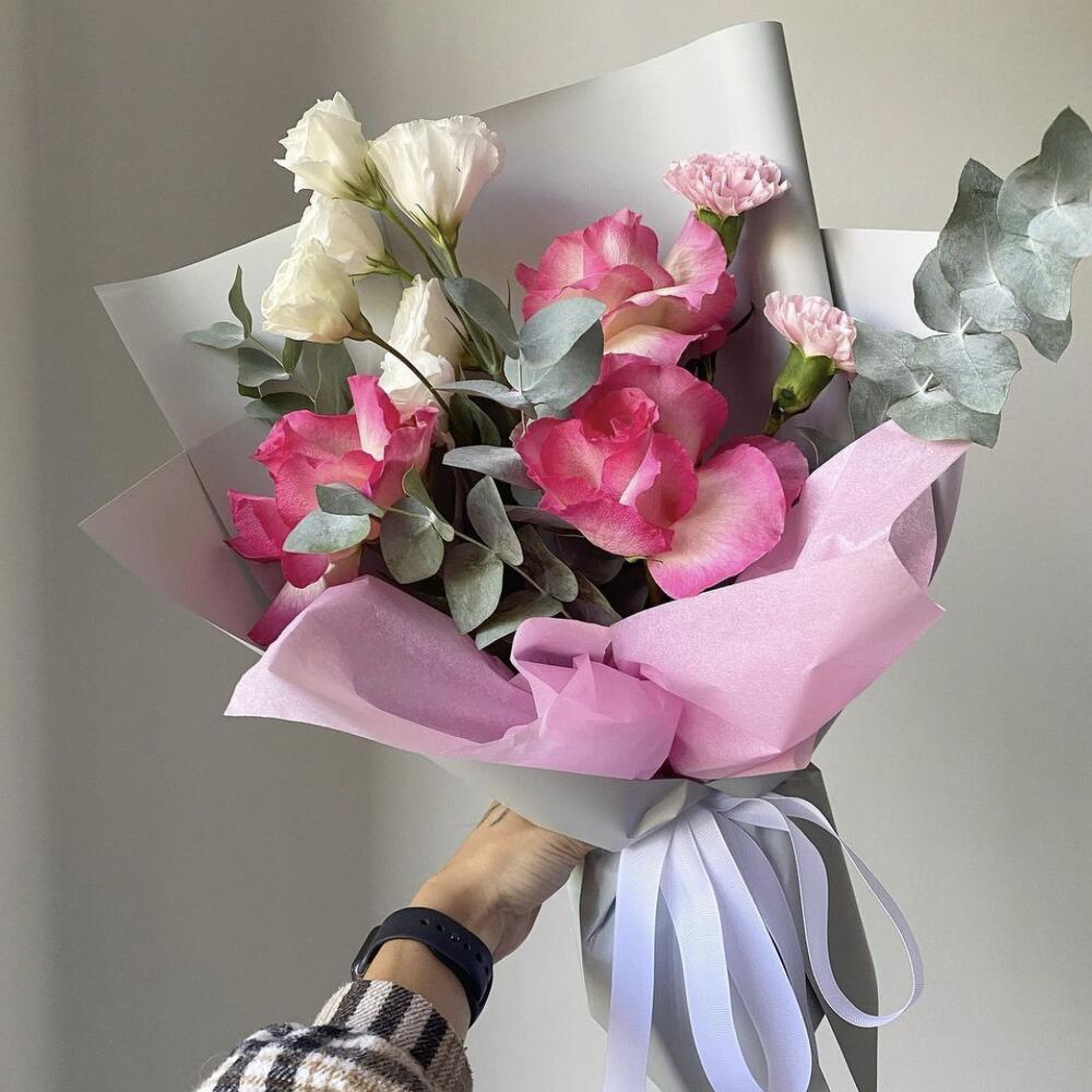 Альстромерии, Гвоздики, Кустовые розы, Лизиантусы, Розы, Хризантемы