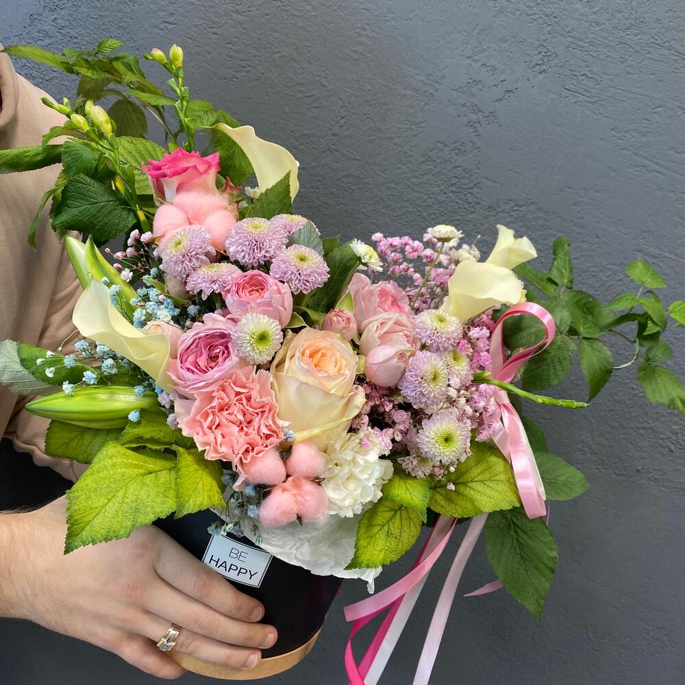 Гипсофила – 2 шт.Калла – 4 шт.Лилия – 1 шт.Роза кустовая – 2 шт.Хлопок – 2 шт.Гвоздика – 2 шт.Коробка шляпная – 1 шт.Сантини – 4 шт.