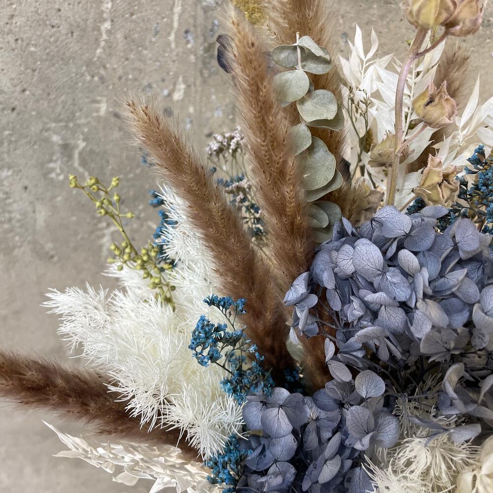 Ваза стекло – 1 шт.гортензия сухоцвет – 1 шт.Эвкалипт сухоцвет – 10 шт.рускус сухоцвет – 5 шт.аспарагус сухоцвет – 5 шт.лимониум сухоцвет – 5 шт.Лаванда пучок – 1 шт.озотамнус сухоцвет – 2 шт.сеттария – 5 шт.Ковыль – 1 шт.Лента атласная – 1 шт.