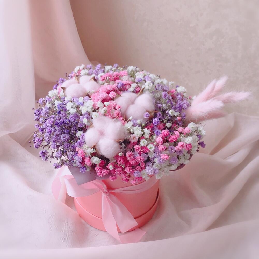 Очаровательная композиция из изысканных свежих цветов.Наполнена множеством соцветий радужной гипсофилы, мягкого хлопка и лагуруса. Собрана в стильной шляпной коробке.Композиция из гипсофилы – необычный подарок, который удивит своей невероятной стойкостью, при правильном и простом уходе.❤️ Ставить композицию в прохладном месте, избегая отопительных приборов и прямых солнечных лучей. ❤️ Подливать немного воды в серединку.Гипсофила не вянет, а становится сухоцветом, сохраняя свой вид. Поэтому композиция продолжит радовать ещё очень долго!Чтобы защитить готовый букет во время доставки от любых погодных условий, мы бережно его упаковываем