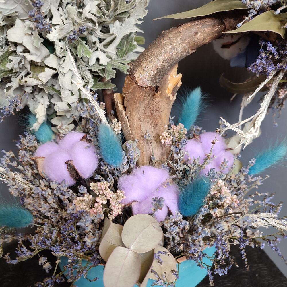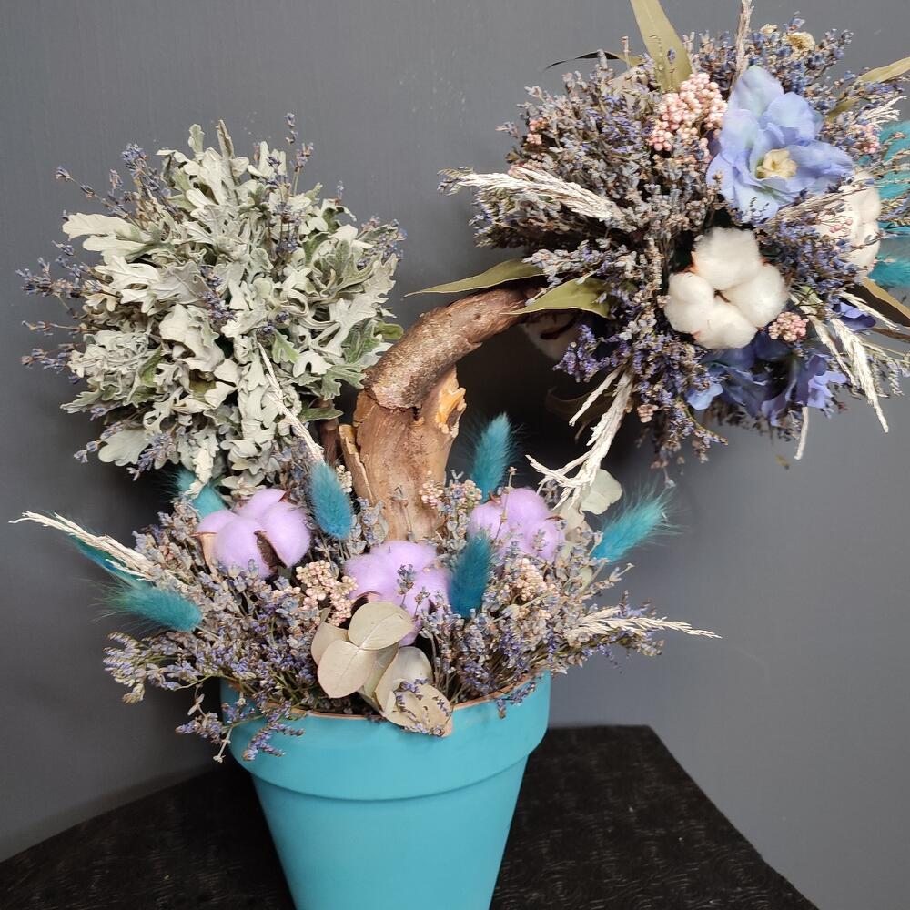 Кашпо керамическое – 1 шт.Оазис флористический – 3 шт.Лаванда (сухоцвет) – 3 шт.Хлопок натуральный – 8 шт.Лагурус (сухоцвет) – 13 шт.Озотамнус – 1 шт.Эвкалипт – 1 шт.цветы искусственные – 7 шт.