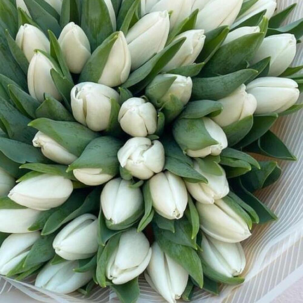 Тюльпан белый – 51 шт.Упаковка дизайнерская – 2 шт.Лента атласная – 2 шт.Открыточка с вашими пожеланиями – 1 шт.хорошее настроение – 100 шт.инструкция по уходу за цветами – 1 шт.коробка переноска – 1 шт.Кризал – 1 шт.